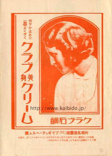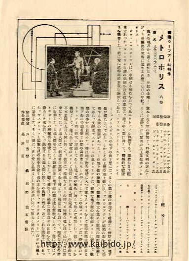 ■ 昭和4年4月9日発行。『メトロポリス』は昭和4年4月3日、大阪・京都・神戸・名古屋・東京の各松竹座と邦楽座、オデヲン座の7館で同時に封切られた。日本初の「全国一斉ロードショー」型式の映画興行である。(A) は表紙。 (B) は見返し。ブリギッテ・ヘルムの写真を使ったクラブ石鹸の広告。(C) は本文。