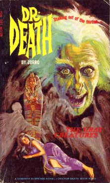 Dr. Death 誌1935年3月号。同誌は怪人の名前を誌名にした最初のヒーロー・パルプ(3号でつぶれた)。デニス・ホイートリ『黒魔団』と同年の刊行であることが興味深い。なおゾロはペンネームで、その正体は、ホラー&探偵パルプ系作家のハロルド・ウォード(ワード)といわれる。 |
